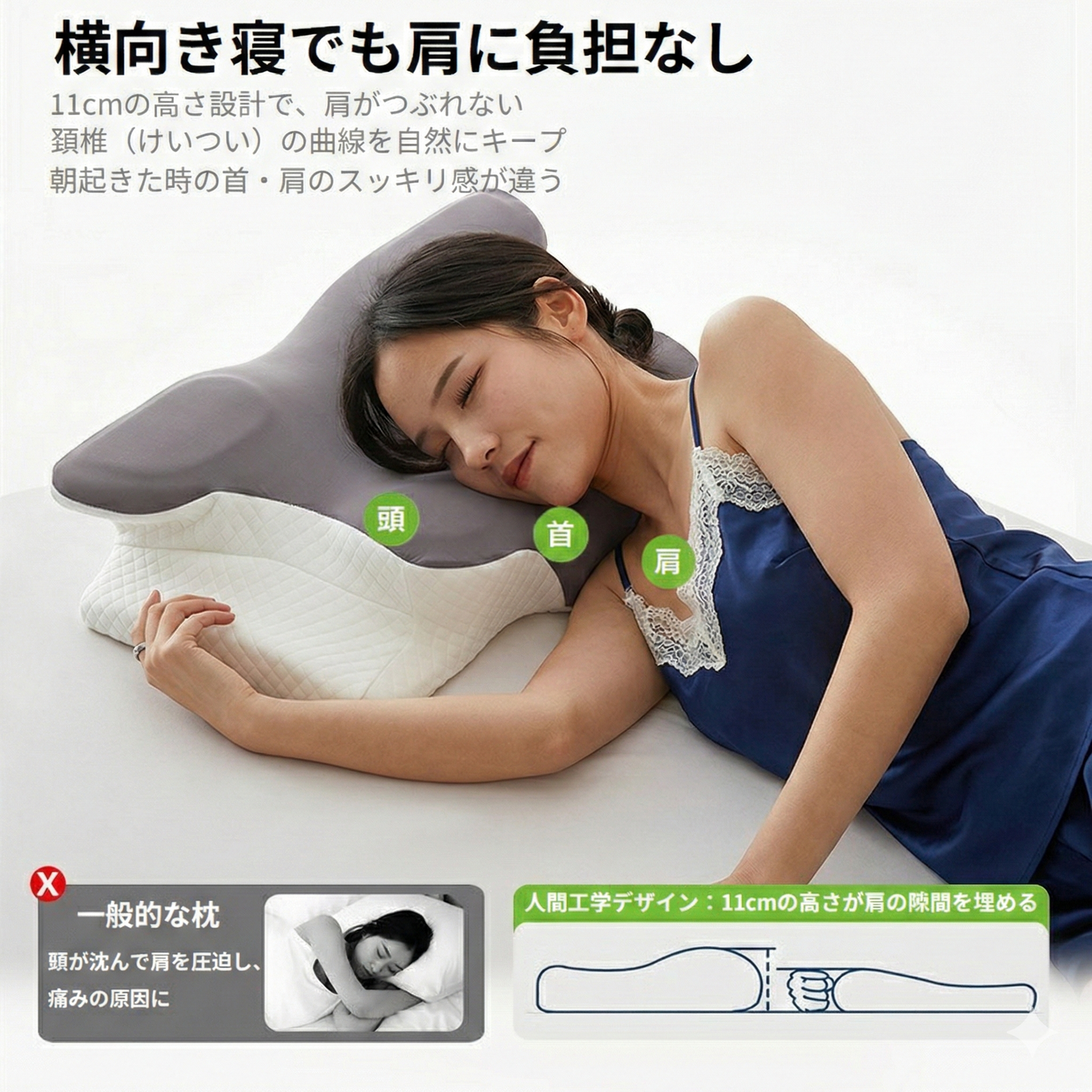もう、朝の首の痛みに悩まない。人間工学に基づいた「11cm」の革命。