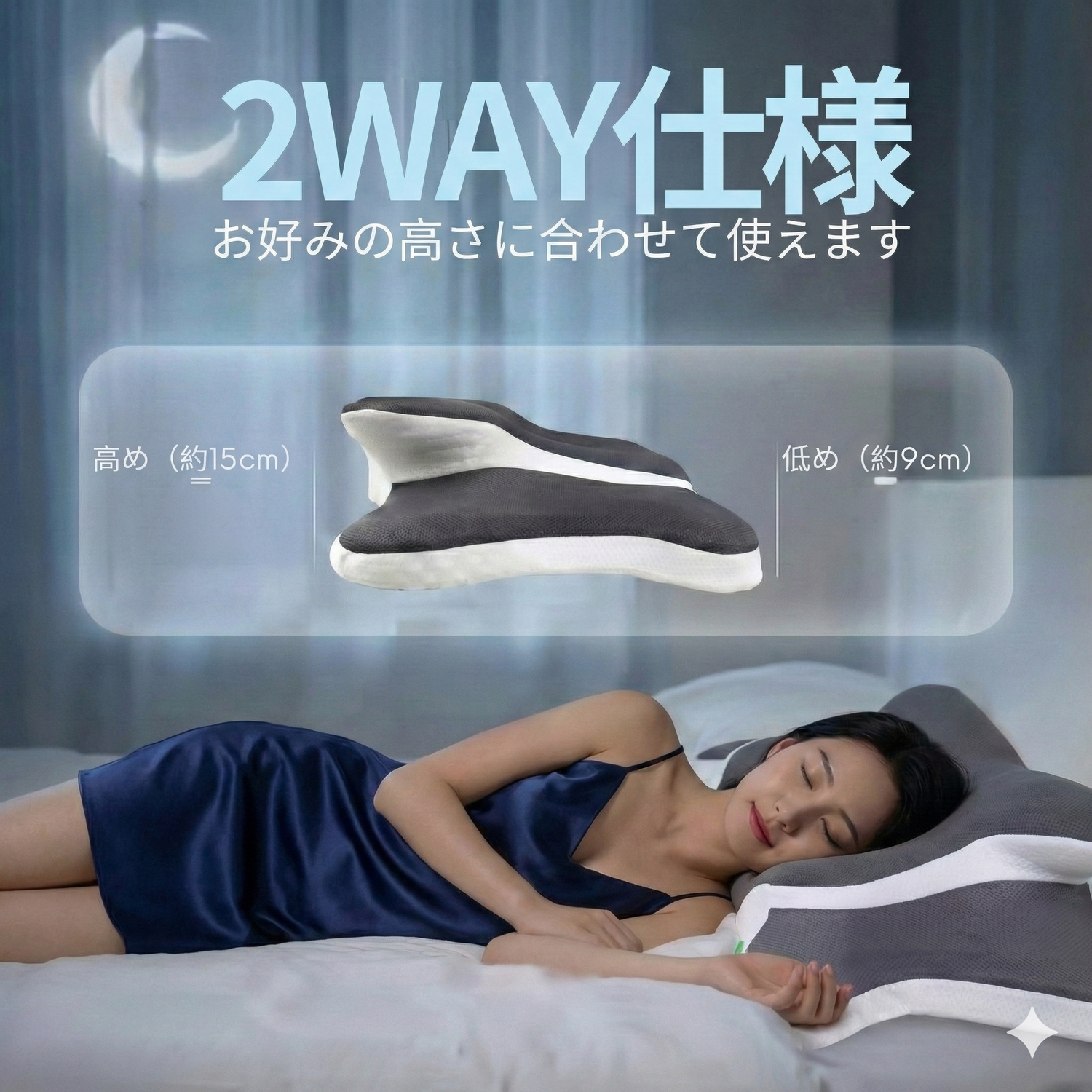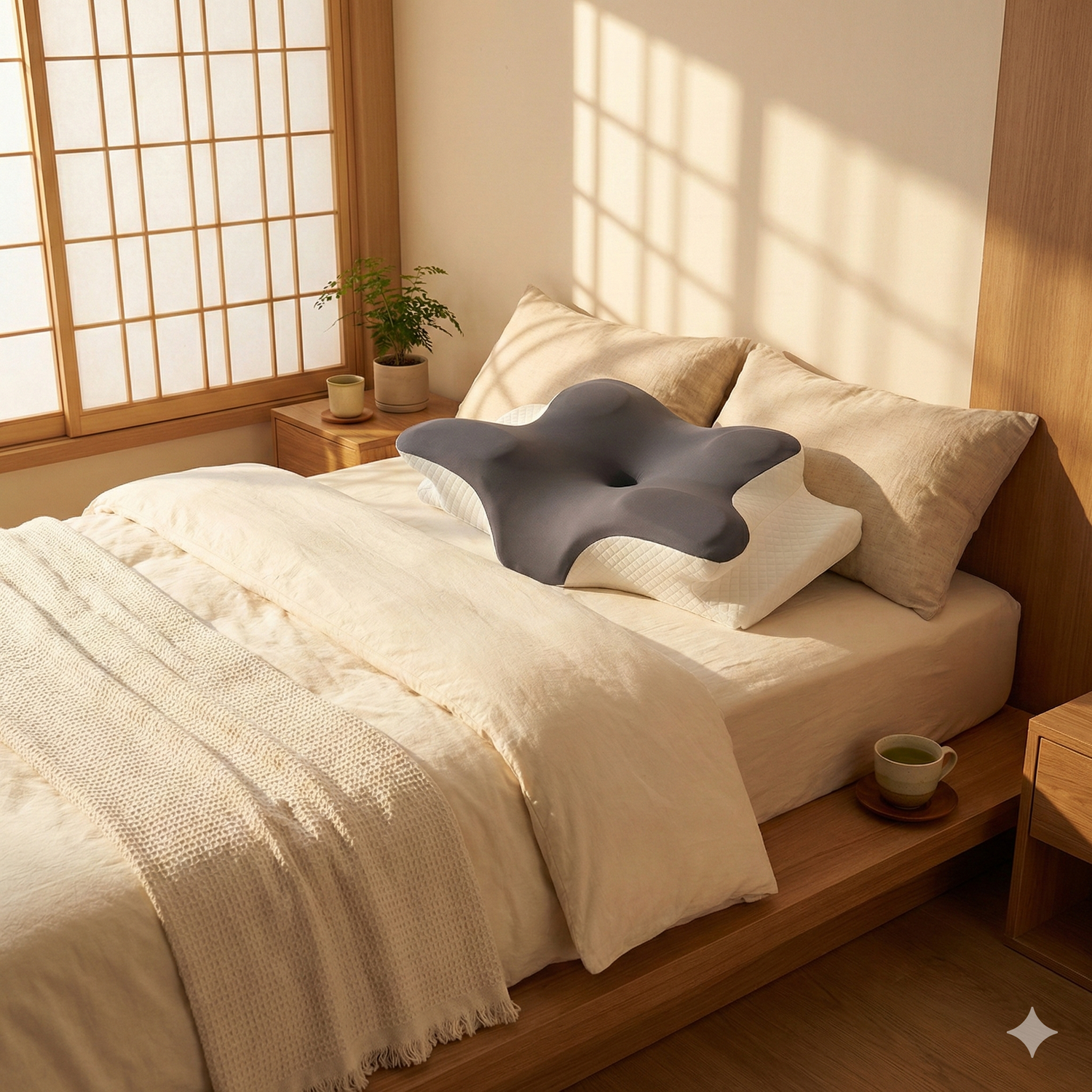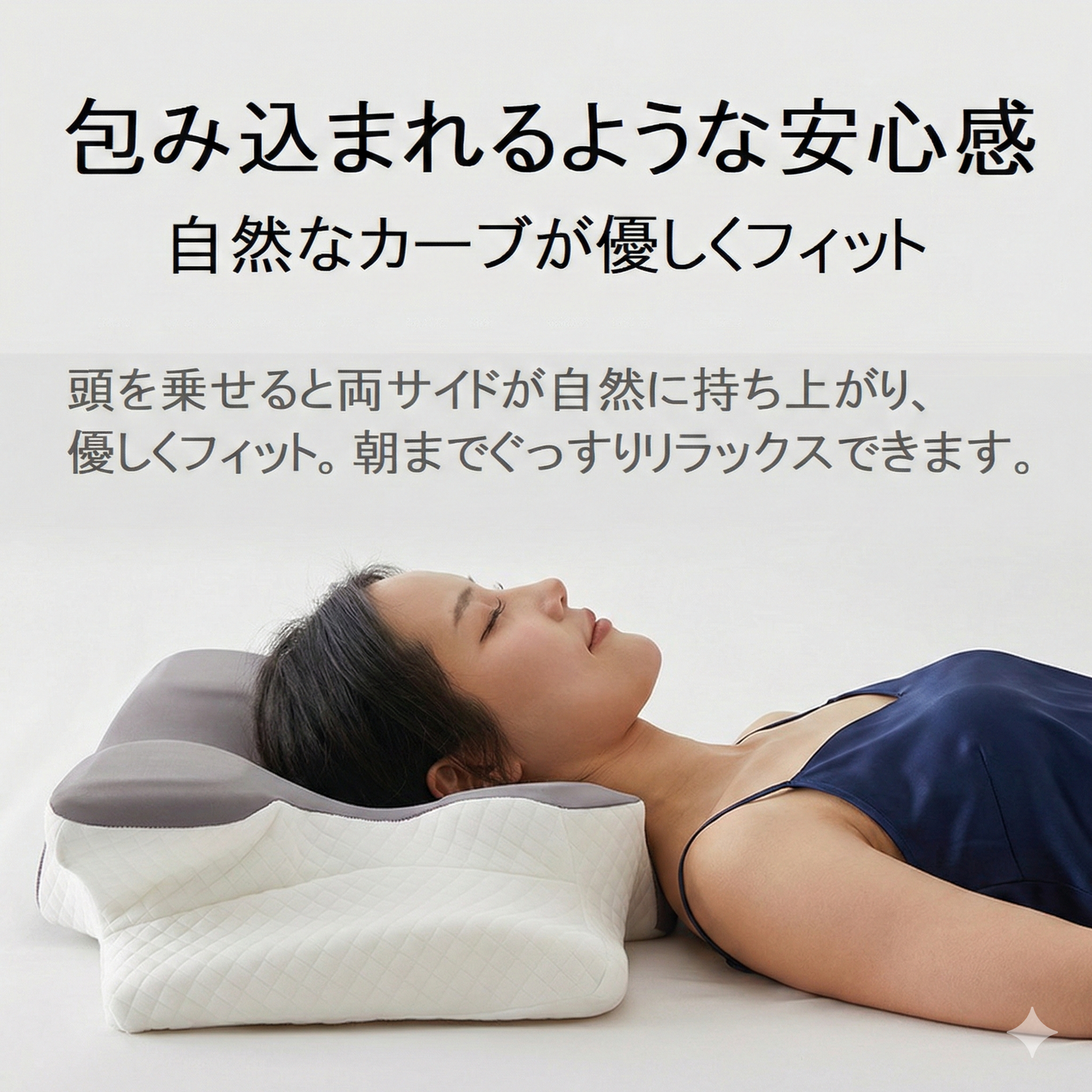 枕に頭を乗せた瞬間、両サイドが自然に持ち上がり、あなたを優しくホールドします。まるで無重力空間にいるかのような心地よさで、首や肩への圧力を分散。深いリラックス状態へと誘い、質の高い睡眠を実現します。