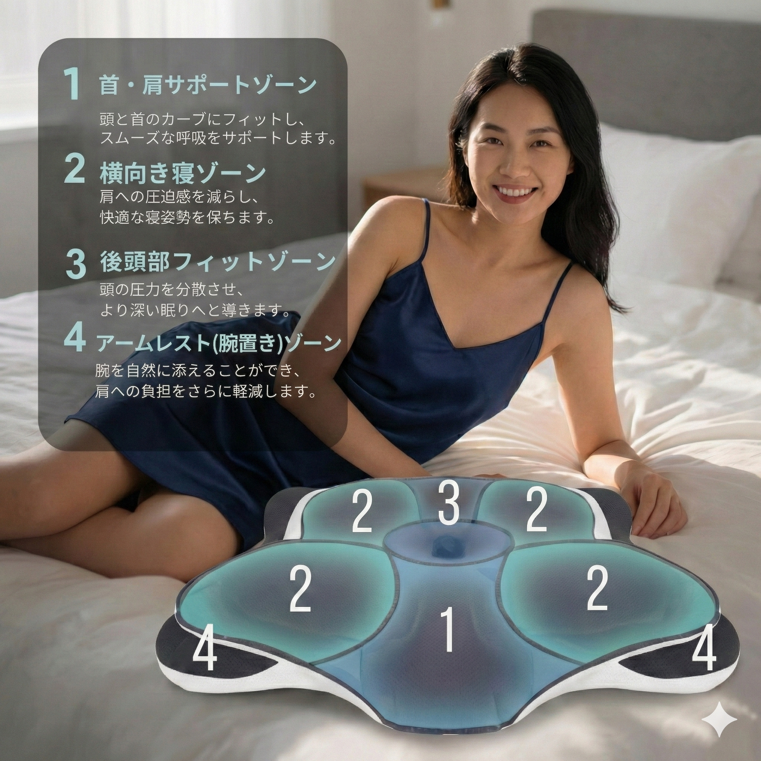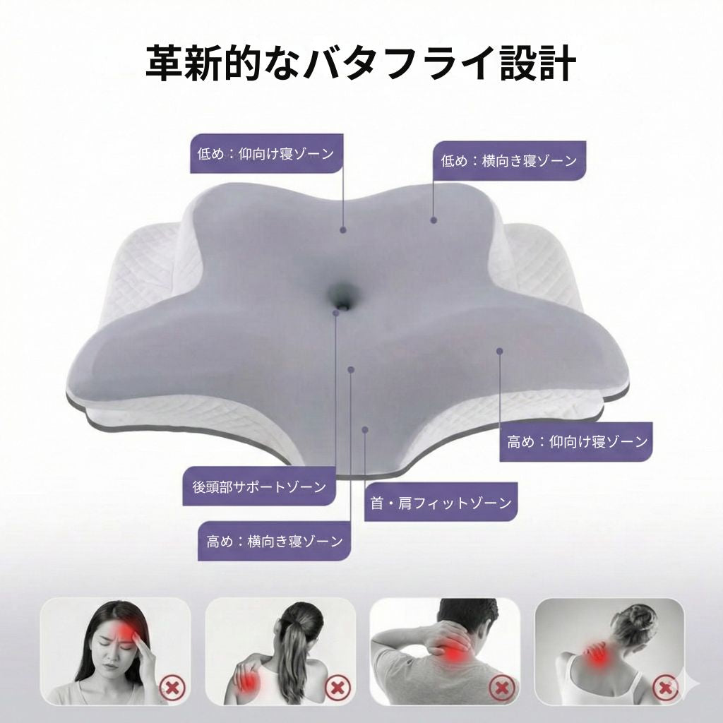 独自のデザインが肩を圧迫せず、スムーズな寝返りをサポート。肩こりに悩む方に最適です。