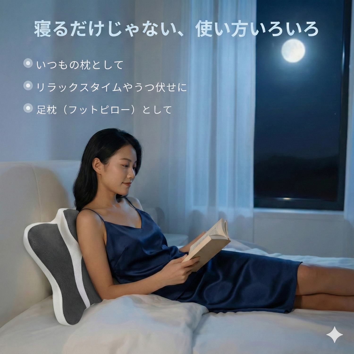 睡眠用のまくらとしてはもちろん、ベッドでの読書やスマホ操作時の背もたれ、むくみが気になる時の足枕(フットピロー)としても大活躍。あなたの毎日の生活に、ワンランク上のくつろぎを提供します。